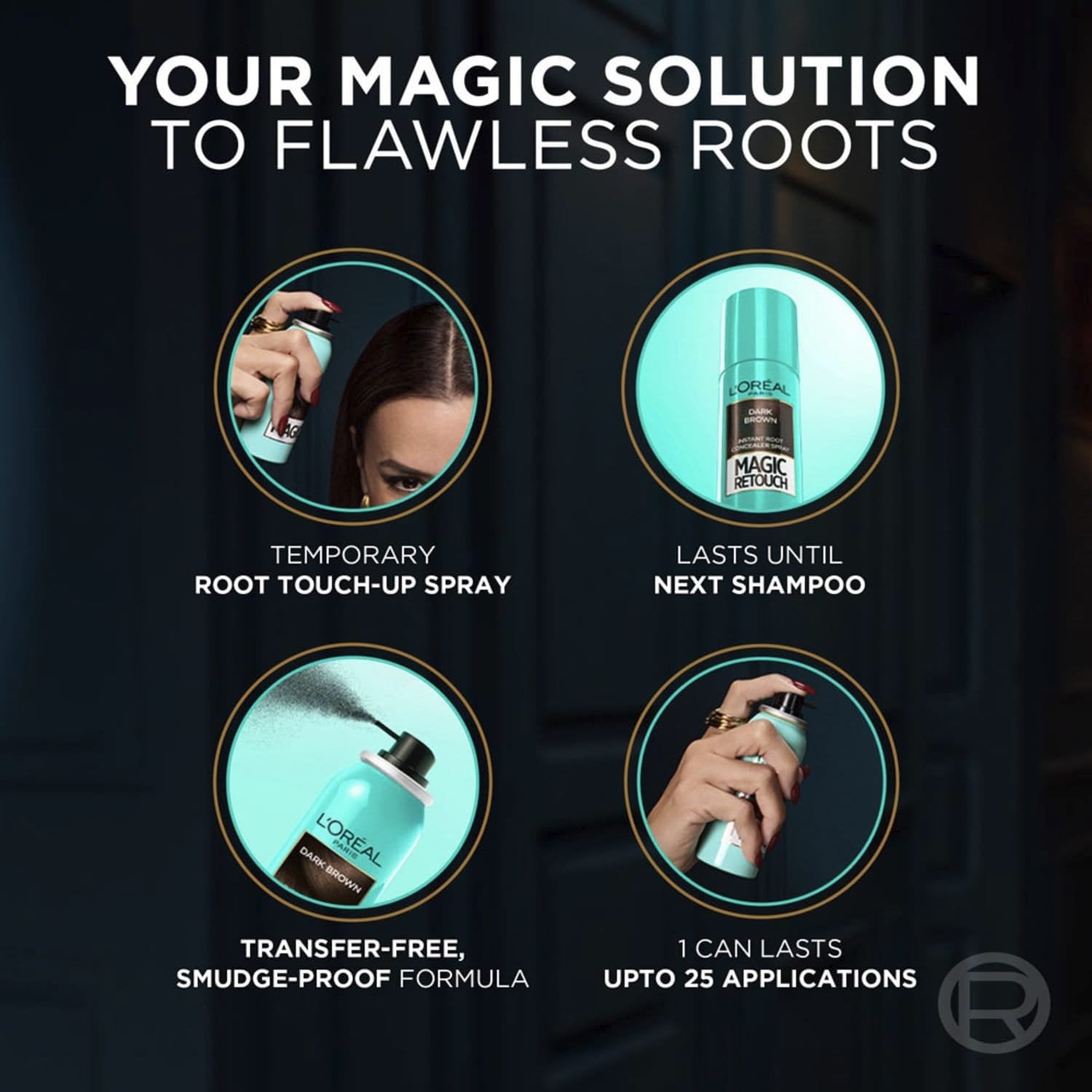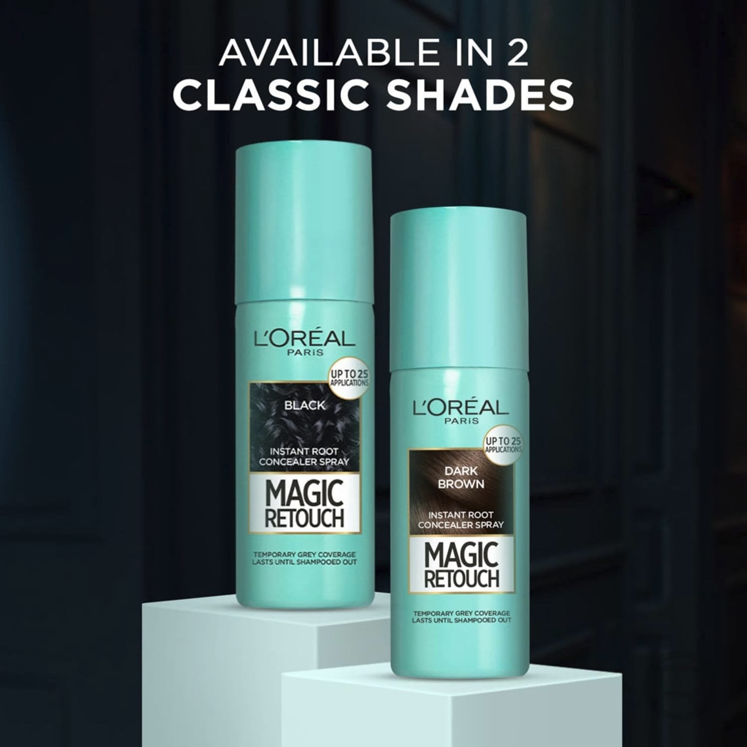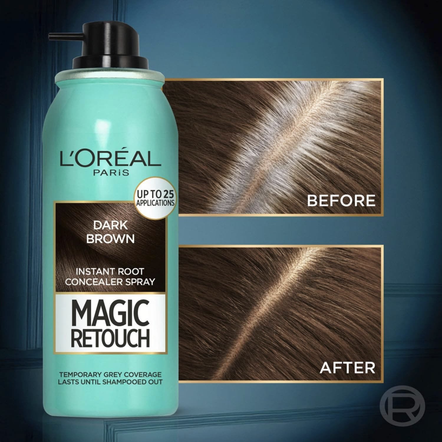 Grey root touch-up spray for dyed hair, Temporary colour until shampooed out, Ideal for in-between salon visits or home colouration Natural looking coverage at the roots, Conceals root regrowth, Turns grey roots back to your desired colour, Available in 9 shades ranging from blonde to black Easy application, Shake well before use, Keep product upright and apply to dry and clean hair, Hold can approx. 13 cm from hair and lightly spray, Avoid overspraying Up to 25 applications in each bottle, Colour stays in place through brushing and combing, Easily washed out with normal shampoo Contents: 1x L'Oréal Magic Retouch Instant Root Concealer Spray, Ideal for Touching Up Grey Root Regrowth, 2 Dark Brown, Volume: 75ml